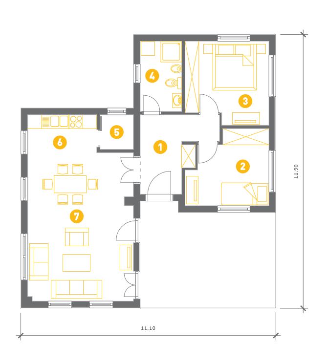 Obje spavaće sobe i kupatilo odvojene su od cjeline koju čine dnevni boravak, kuhinja i trpezarija.